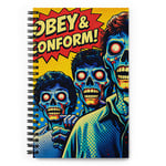 This horror pop-art notebook features a bold comic-style design with zombie characters and the striking phrase “Obey & Conform.” Inspired by retro sci-fi and cult horror aesthetics, this journal makes a powerful visual statement for creatives who love dark art and edgy design.